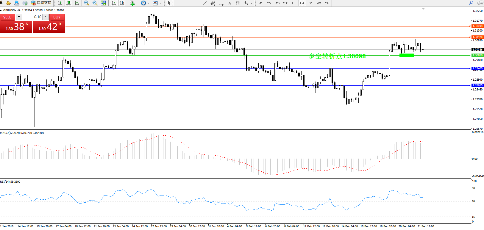 交易策略:1.30098上方看涨,目标1.30970、1.31498