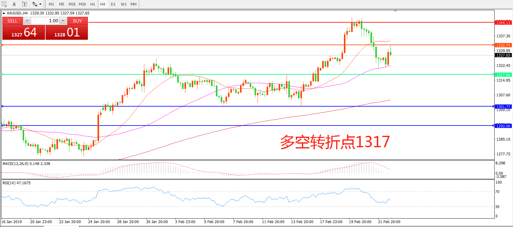 4小时图看,金价整体呈现冲高回落走势,短线回调至55均线支撑企稳。形态上依然维持着多头走势,但有形成高位反转的可能,重点关注下方1310一线支撑。