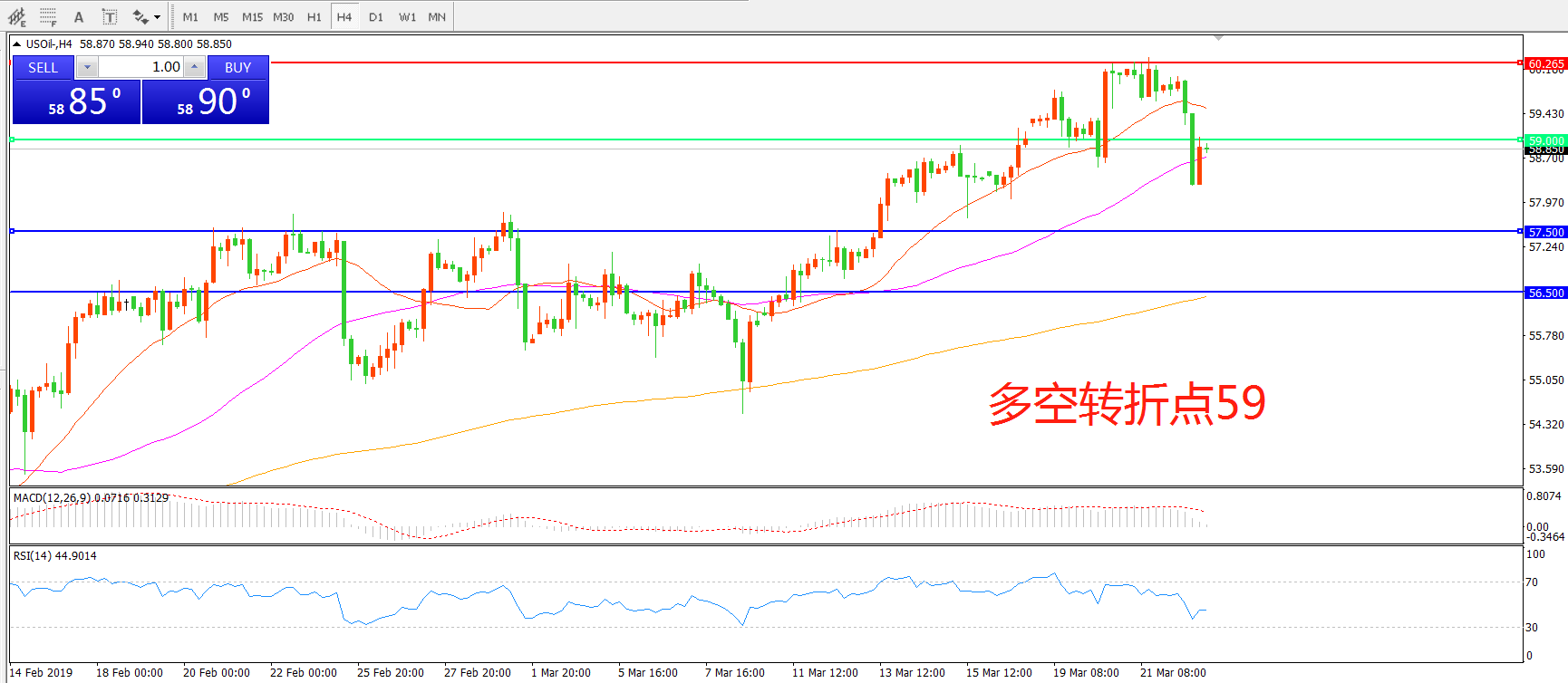 4小时图看,油价触碰60美元阻力后连续下行,显示上方阻力依然较大,21均线出现拐头,MACD红柱减少,日内有回落可能,重点关注55均线的支撑情况.