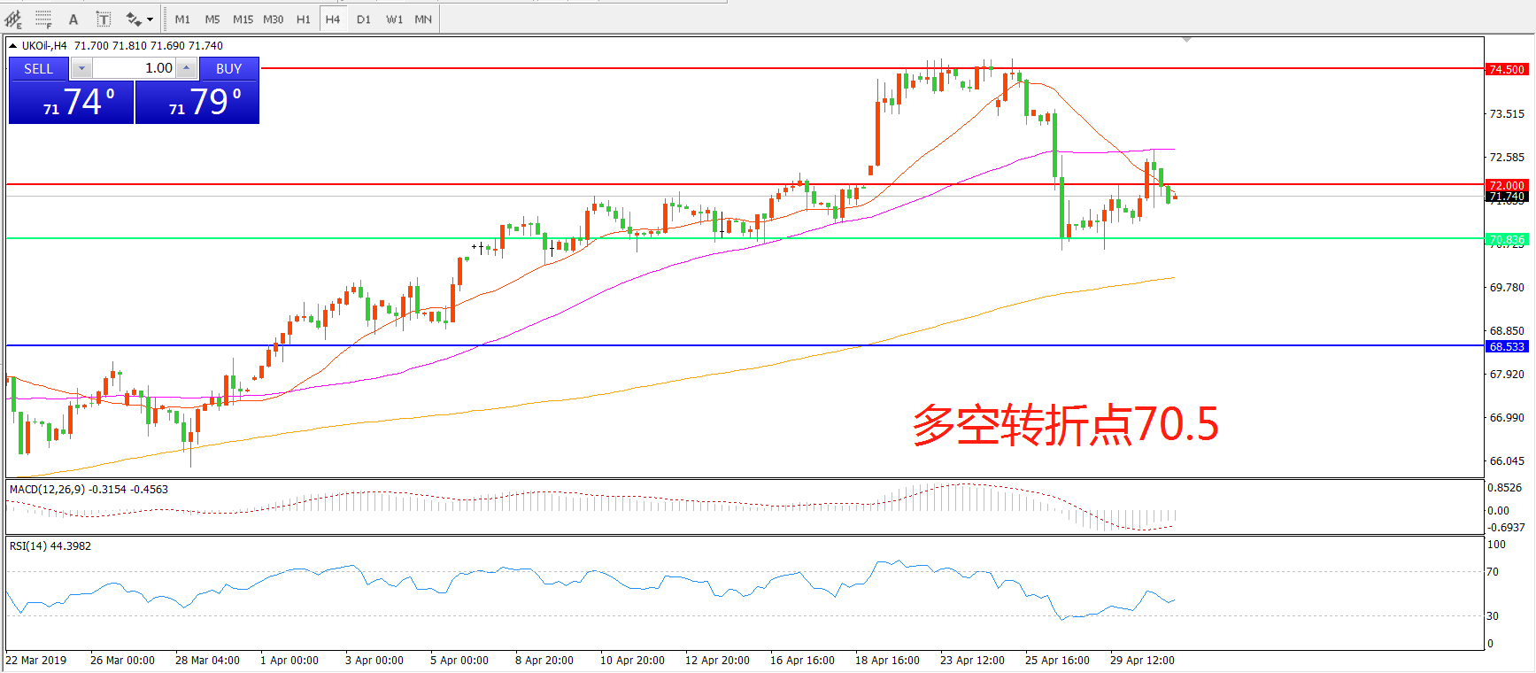 4小时图看,油价冲击72.7阻力后震荡下行,显示55均线附近阻力较强, 200均线逐渐上移,短期振幅预计逐渐收窄,MACD绿柱减少, RSI指标拐头向上,日内重点关注EIA库存数据,如数据利多,油价可能迎来反弹。