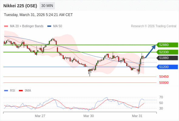 在 51200 之上,看涨,目标价位为 52330 ,然后为 52880 。