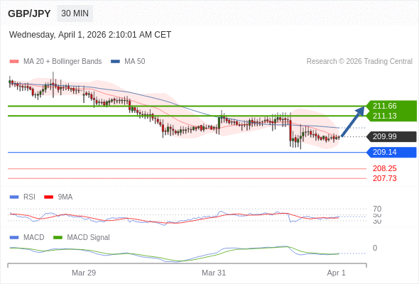 英镑/日元 当日内: 有上涨的可能,目标价位定在 211.66 。