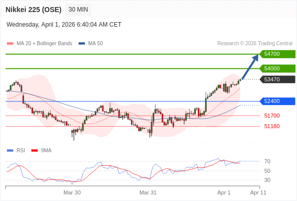 在 52400 之上,看涨,目标价位为 54000 ,然后为 54700 。