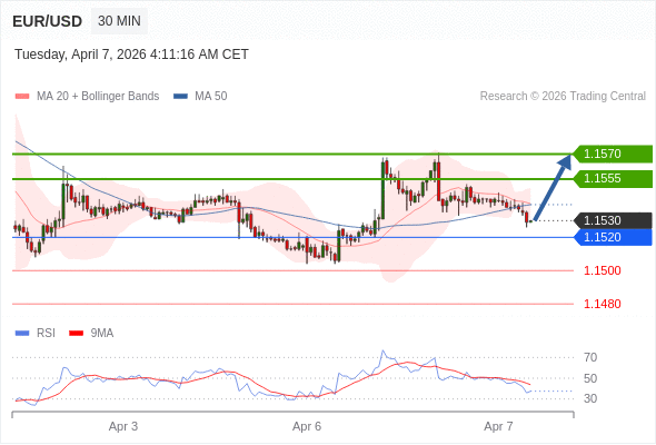 在 1.1520 之上,看涨,目标价位为 1.1555 ,然后为 1.1570 。