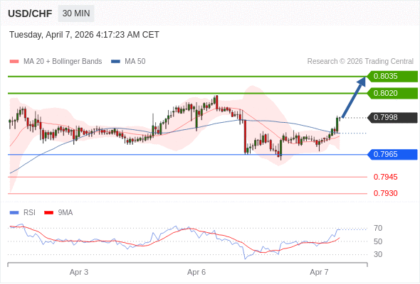 在 0.7965 之上,看涨,目标价位为 0.8020 ,然后为 0.8035 。