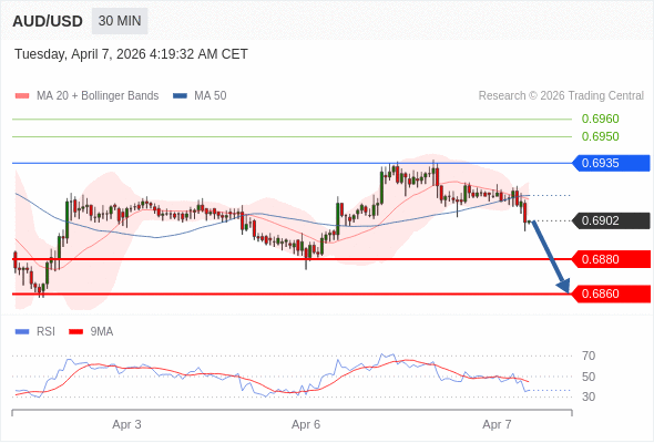 在 0.6935 之下,看跌,目标价位为 0.6880 ,然后为 0.6860 。