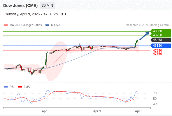 在 48130 之上,看涨,目标价位为 48750 ,然后为 48980 。