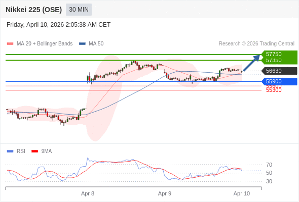 日经225股指期货 (OSE) 当日内: 在55900之上,看涨。