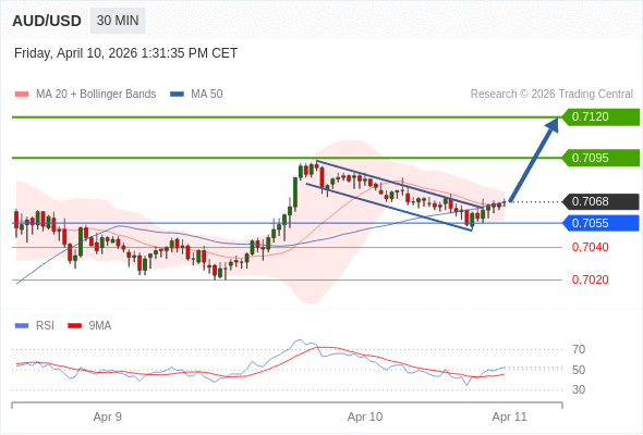 在 0.7055 之上,看涨,目标价位为 0.7095 ,然后为 0.7120 。