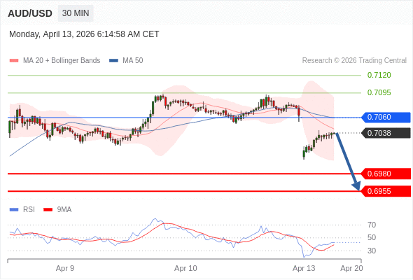 交易策略: 在 0.7060 之下,看跌,目标价位为 0.6980 ,然后为 0.6955 。