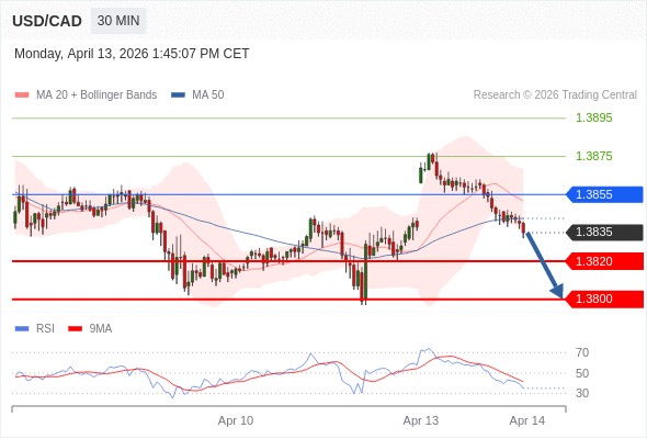 在 1.3855 之下,看跌,目标价位为 1.3820 ,然后为 1.3800 。