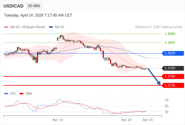 在 1.3825 之下,看跌,目标价位为 1.3760 ,然后为 1.3735 。