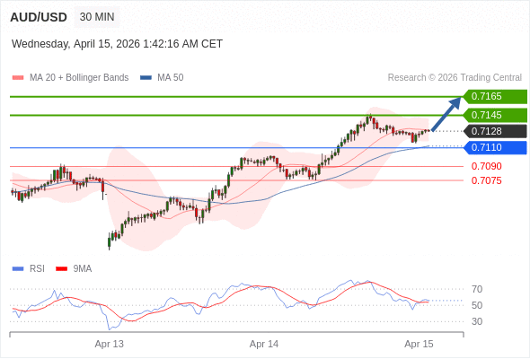 在 0.7110 之上,看涨,目标价位为 0.7145 ,然后为 0.7165 。