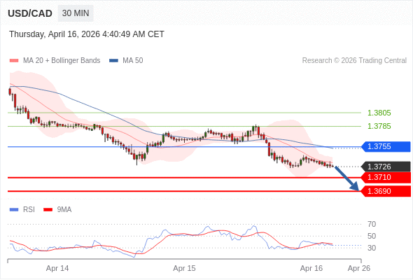 美元/加元 当日内: 目标位为1.3710。