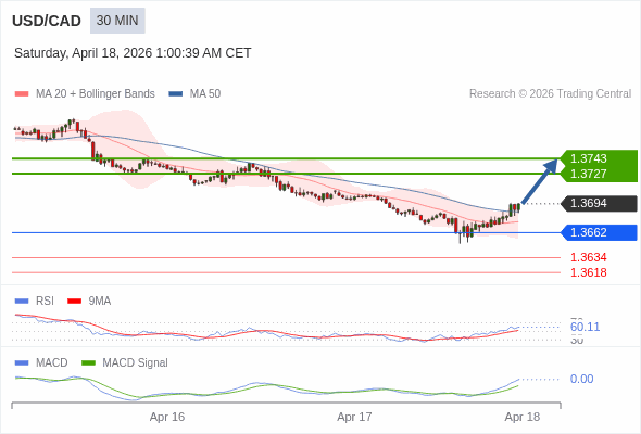 美元/加元 当日内 : 看涨,当 1.3662 为支撑位。