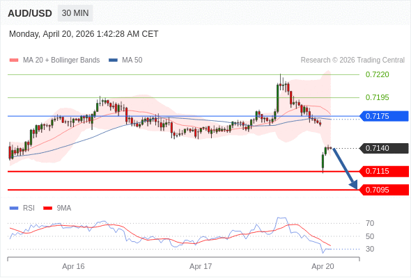 在 0.7175 之下,看跌,目标价位为 0.7115 ,然后为 0.7095 。