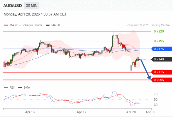 在 0.7175 之下,看跌,目标价位为 0.7115 ,然后为 0.7095 。