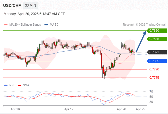 在 0.7805 之上,看涨,目标价位为 0.7845 ,然后为 0.7860 。