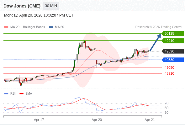 在 49330 之上,看涨,目标价位为 49910 ,然后为 50125 。