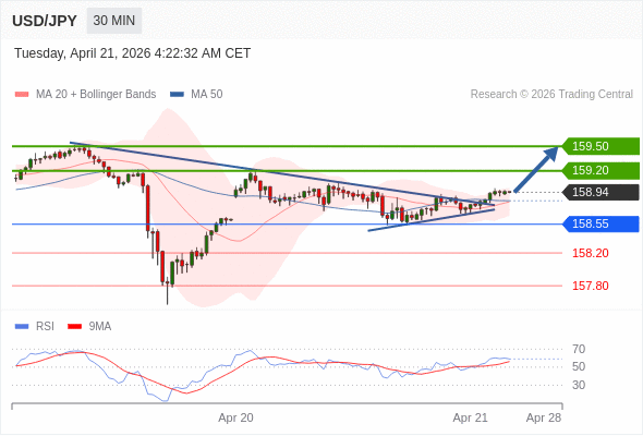 在 158.55 之上,看涨,目标价位为 159.20 ,然后为 159.50 。