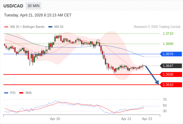 在 1.3670 之下,看跌,目标价位为 1.3630 ,然后为 1.3610 。