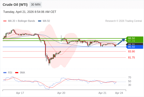 在 85.50 之上,看涨,目标价位为 87.70 ,然后为 88.50 。
