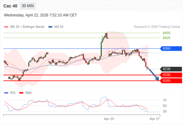 Cac 40 当日内: 短期关键阻力位在8360。