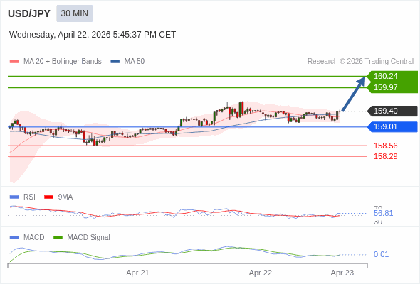 美元/日元 当日内 : 看涨,当 159.01 为支撑位。