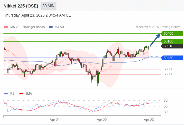在 59450 之上,看涨,目标价位为 60100 ,然后为 60400 。