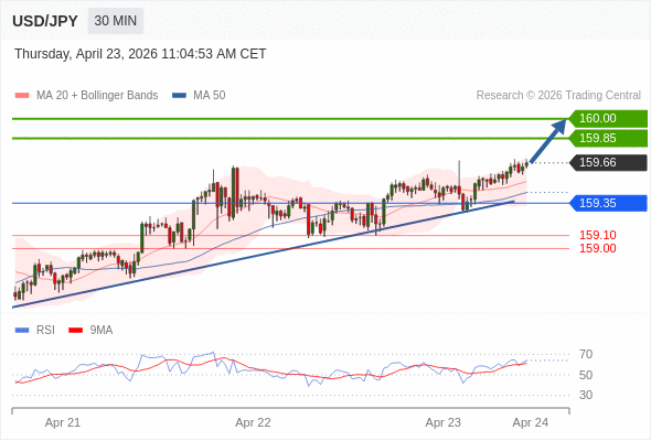 在 159.35 之上,看涨,目标价位为 159.85 ,然后为 160.00 。