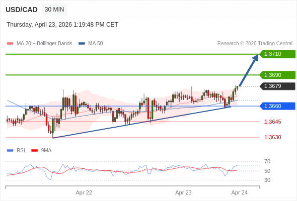 在 1.3660 之上,看涨,目标价位为 1.3690 ,然后为 1.3710 。