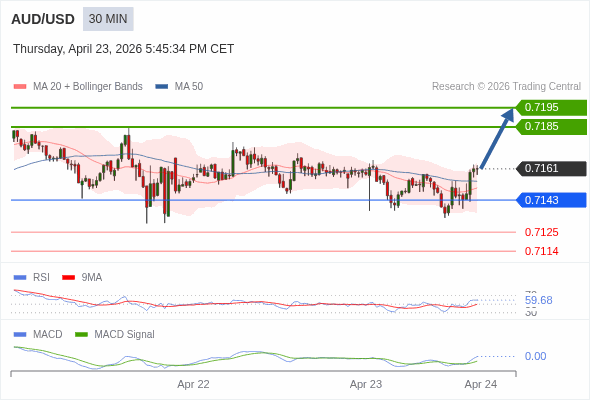 澳元/美元 当日内 : 看涨,当 0.7143 为支撑位。