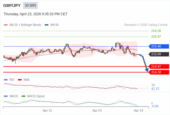 英镑/日元 当日内 : 看跌,在 215.48 之下。