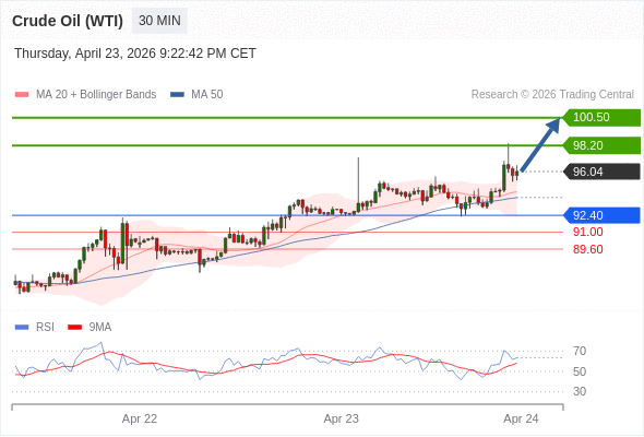在 92.40 之上,看涨,目标价位为 98.20 ,然后为 100.50 。