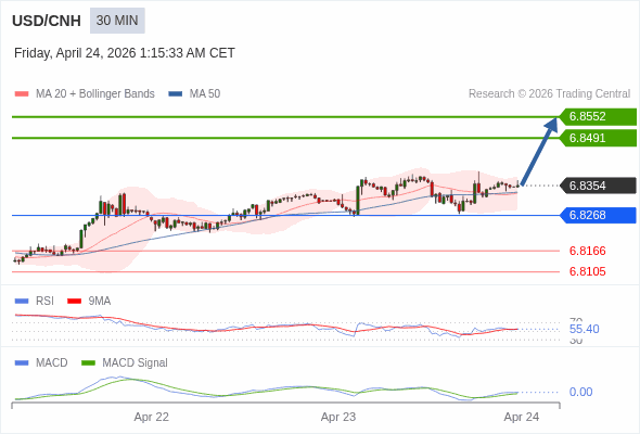 美元/人民币 当日内 : 看涨,当 6.8268 为支撑位。