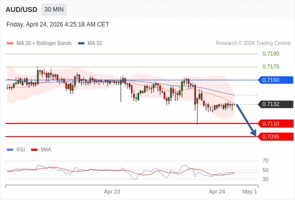 交易策略: 在 0.7160 之下,看跌,目标价位为 0.7110 ,然后为 0.7095 。