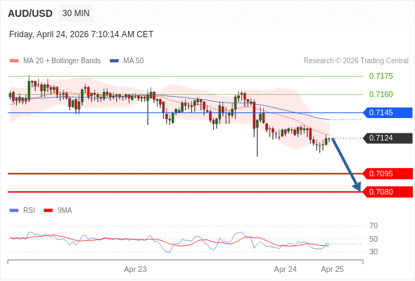 交易策略: 在 0.7145 之下,看跌,目标价位为 0.7095 ,然后为 0.7080 。