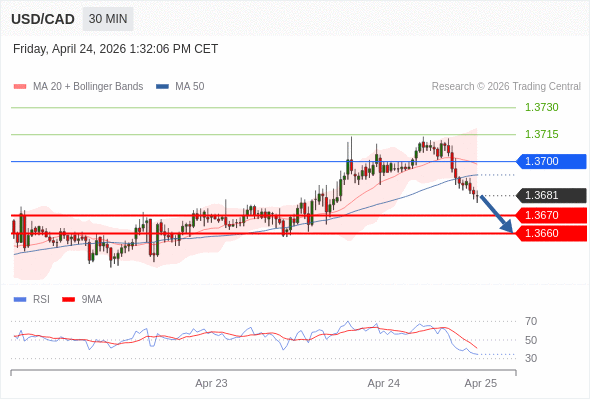 在 1.3700 之下,看跌,目标价位为 1.3670 ,然后为 1.3660 。