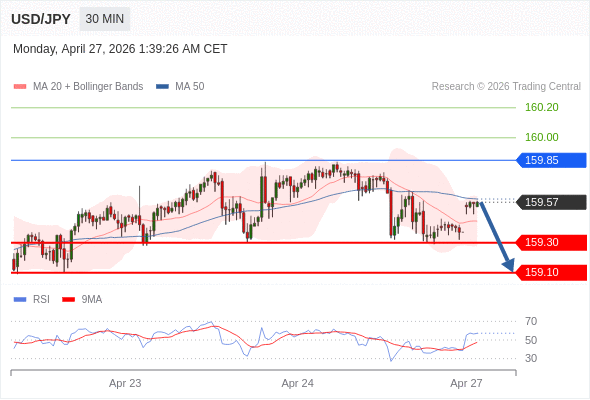在 159.85 之下,看跌,目标价位为 159.30 ,然后为 159.10 。