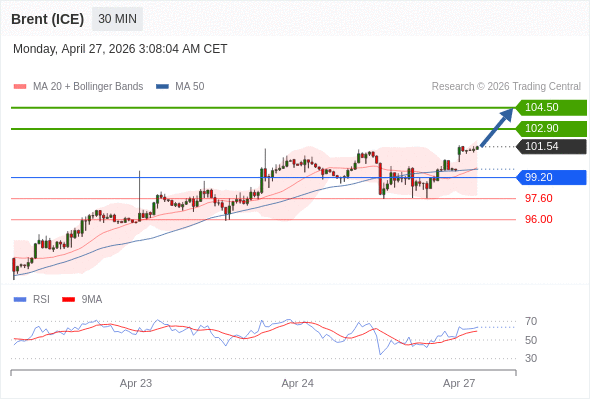 布伦特原油 (ICE) (N6) 当日内: 期待104.50。