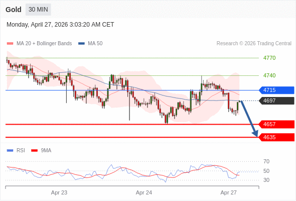 在 4715 之下,看跌,目标价位为 4657 ,然后为 4635 。