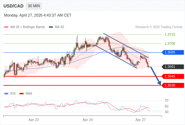 在 1.3685 之下,看跌,目标价位为 1.3645 ,然后为 1.3630 。