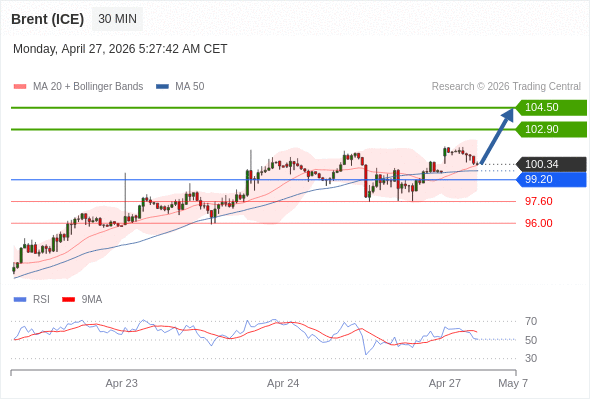 布伦特原油 (ICE) (N6) 当日内: 在99.20之上,看涨。