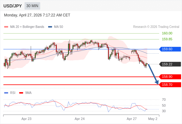 在 159.60 之下,看跌,目标价位为 158.90 ,然后为 158.70 。
