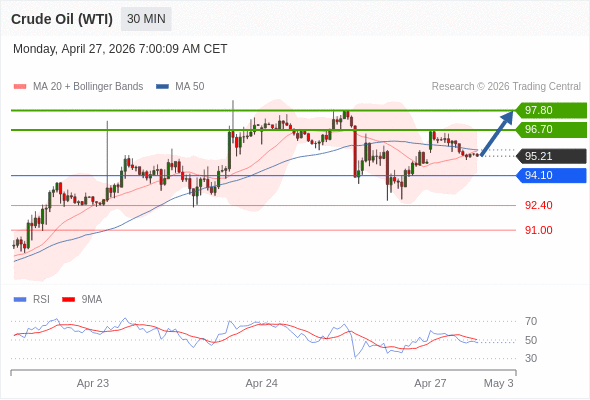 在 94.10 之上,看涨,目标价位为 96.70 ,然后为 97.80 。