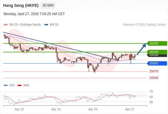 在 25850 之上,看涨,目标价位为 26100 ,然后为 26290 。