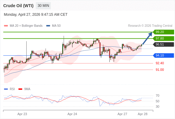 在 94.10 之上,看涨,目标价位为 97.80 ,然后为 99.20 。