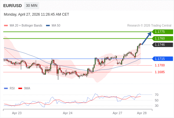 在 1.1715 之上,看涨,目标价位为 1.1760 ,然后为 1.1775 。
