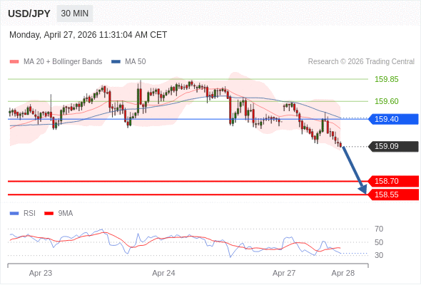 在 159.40 之下,看跌,目标价位为 158.70 ,然后为 158.55 。