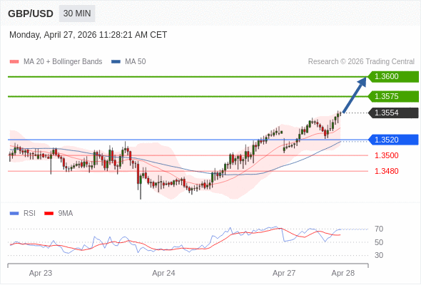 在 1.3520 之上,看涨,目标价位为 1.3575 ,然后为 1.3600 。